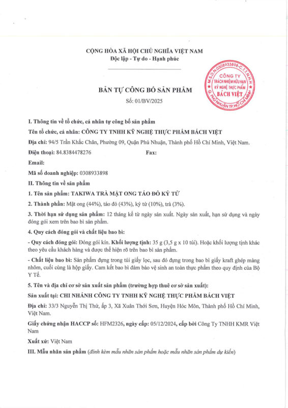 - Sản phẩm: Takiwa Trà Mật Ong Táo Đỏ Kỷ Tử đỏ